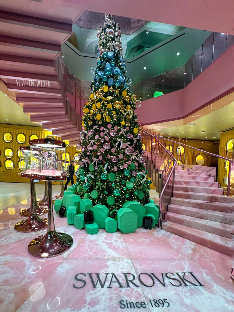 Designed in soft pastel pinks, greens, yellows, and creams, the space feels like stepping into a luxurious jewelry box. 💎 The Swarovski Christmas Tree rises beside the store’s staircase, a masterpiece shimmering with crystal-covered ornaments, glittering décor, and limited-edition holiday pieces perfect for gifting or simply soaking up the festive ambiance.