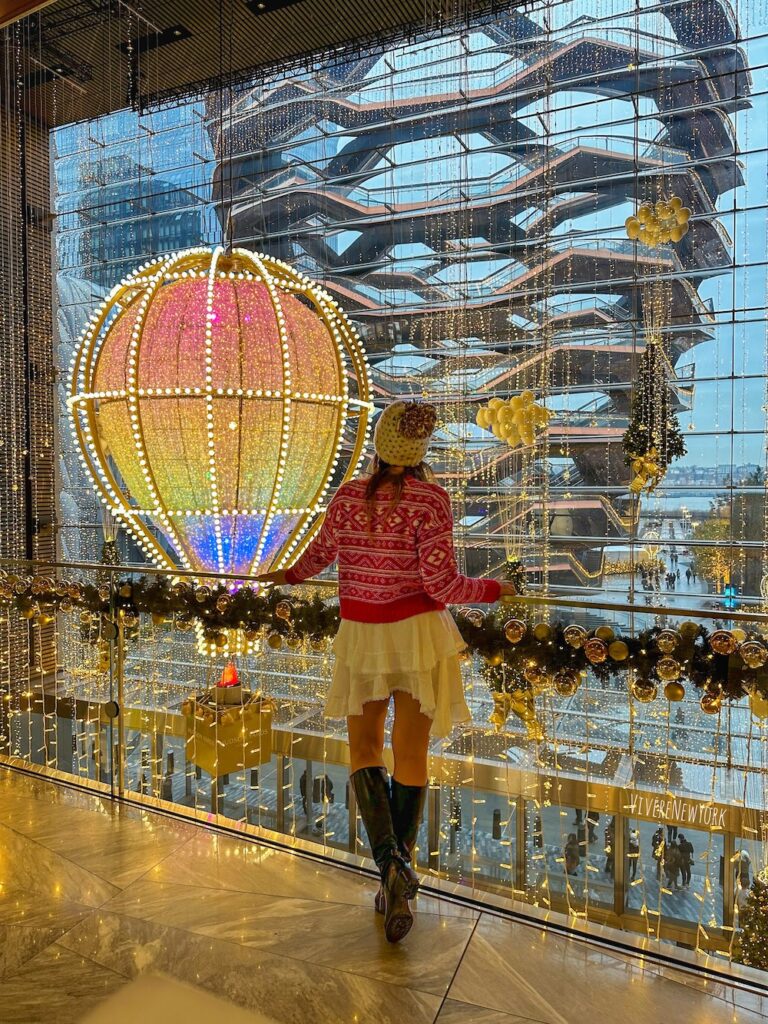 Prepare to be dazzled by Hudson Yards’ 725 evergreen trees, each illuminated to create a gleaming forest of light. The display includes a 16-foot tall illuminated hot air balloon, hundreds of glittering ornaments, and over two million twinkling white lights that transform the space into one of NYC’s most breathtaking winter wonderlands.