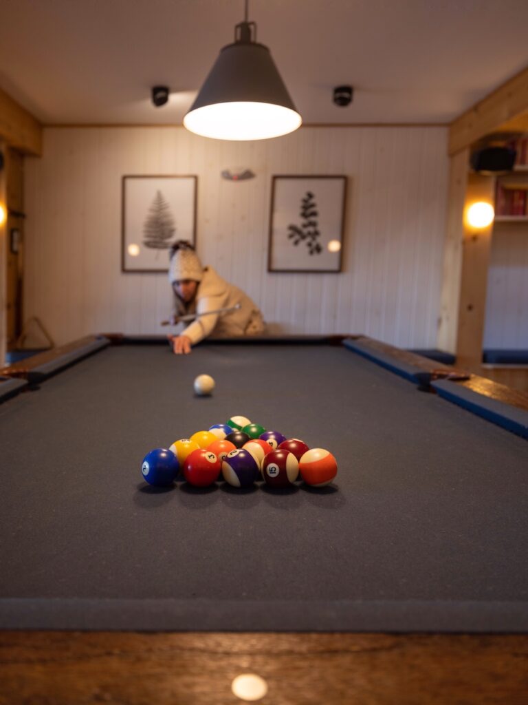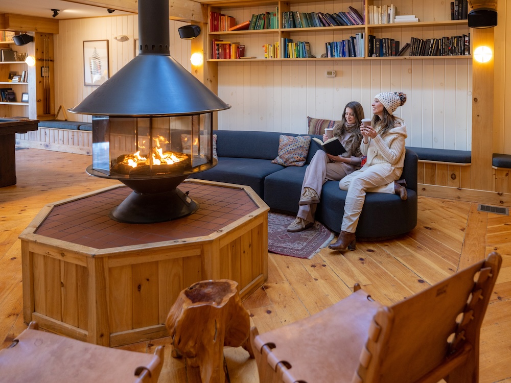• The Library inside the main lodge, with a circular fireplace, books, billiards table, and a cozy co-working space