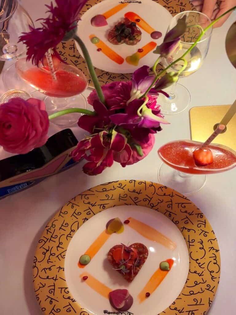 His art is pure happiness. Vibrant, playful, and contagious. His signature hearts were everywhere: on plates, mugs, even silverware. Each table was set with dinnerware designed by him, heart-shaped napkins, and candlelight. Every single detail screamed love 💕