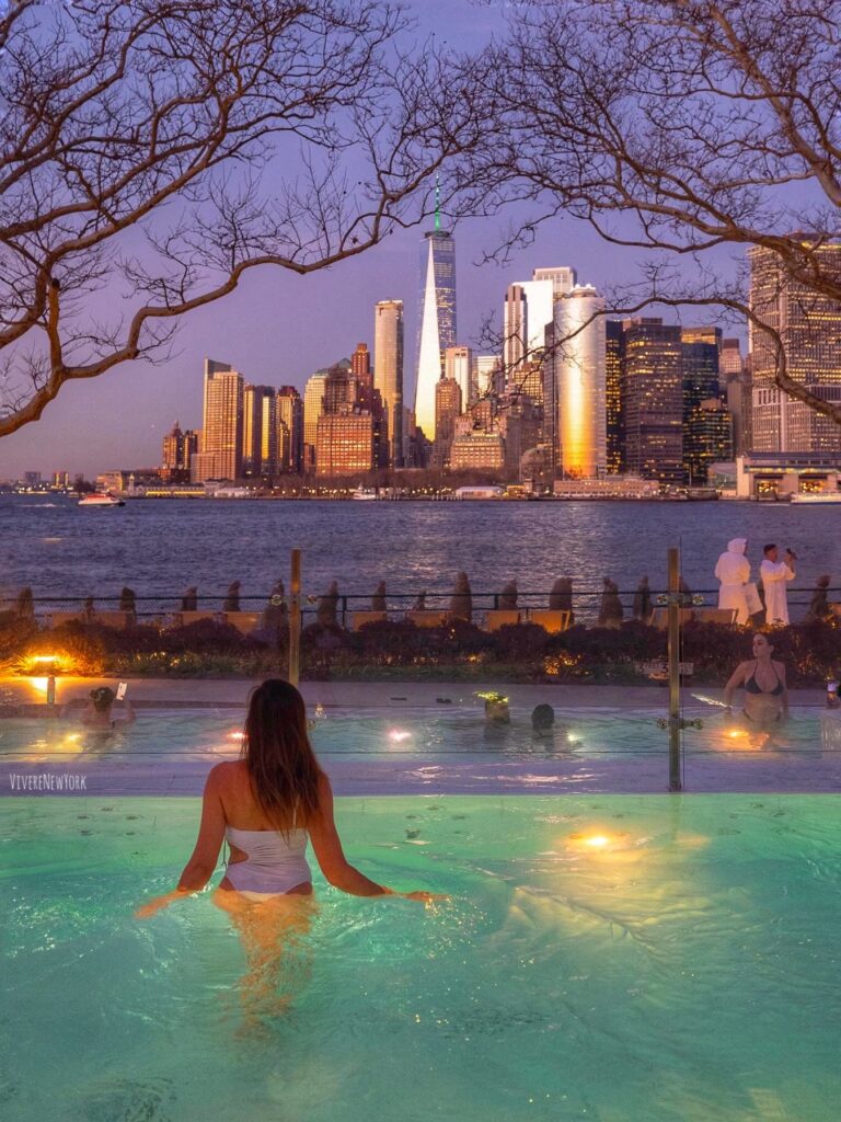 Outside: two heated infinity pools facing the Manhattan skyline, cozy heated paths and igloos for winter visits.