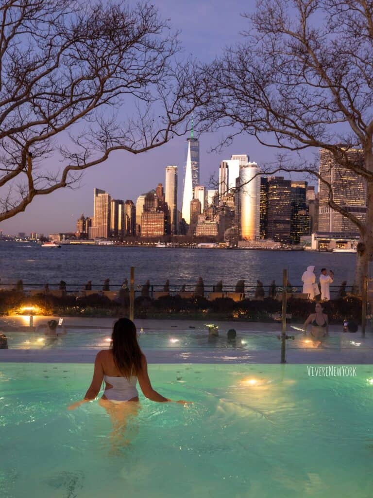 Absolutely, YES! Winter is the best time to soak in the heated outdoor pools while enjoying the NYC skyline. The spa has enclosed heated tunnels, heated igloos (they’re setting them up now), and cozy blankets to keep you warm. 🥶🔥
