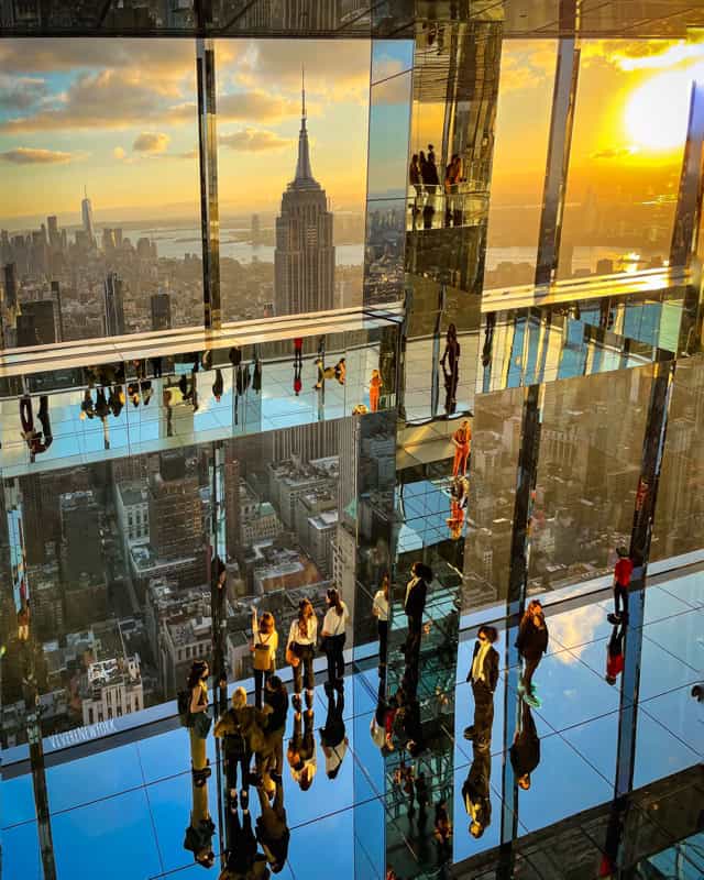 Mirrored walls, fully transparent glass skyboxes, and ceilings offer stunning and unique perspective of the NYC skyline: it’s hard to distinguish reflections versus reality.